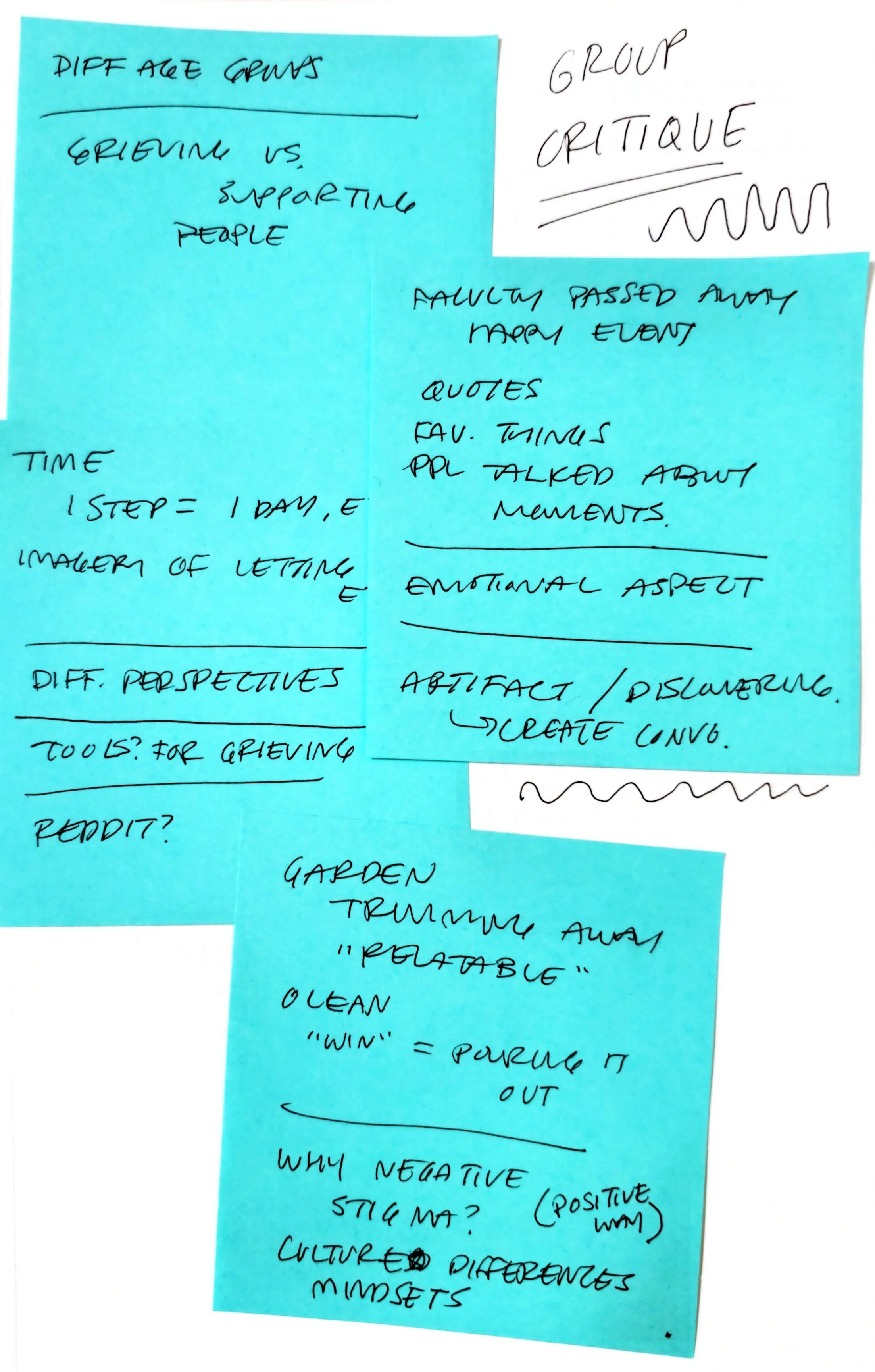 During the mini group critique during class, I wanted to receive people’s feedback and thoughts on my current idea to create a board game around grief and loss.
